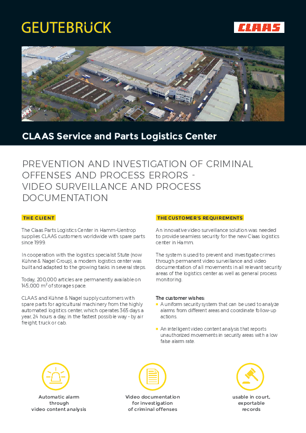 CLAAS Service and Parts Logistics Center PREVENTION AND INVESTIGATION OF CRIMINAL OFFENSES AND PROCESS ERRORS VIDEO SURVEILLANCE AND PROCESS DOCUMENTATION THE CLIENT THE CUSTOMER‘S REQUIREMENTS The…