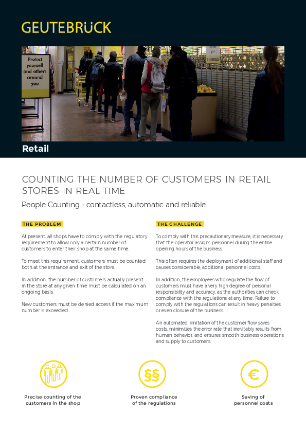 Retail COUNTING THE NUMBER OF CUSTOMERS IN RETAIL STORES IN REAL TIME People Counting - contactless, automatic and reliable THE PROBLEM THE CHALLENGE At present, all shops have to comply with the…