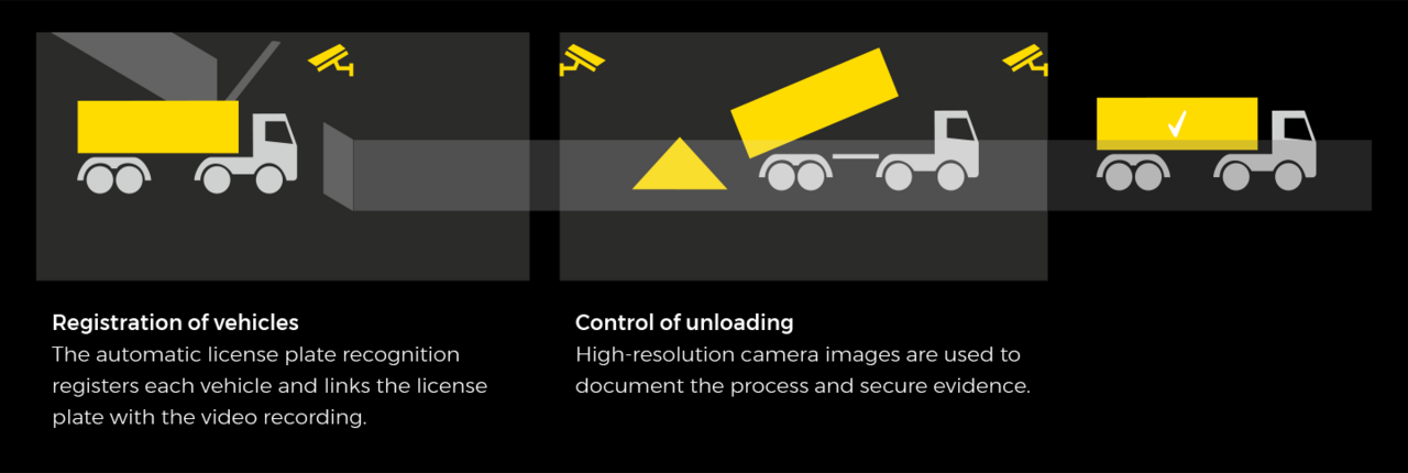 Each vehicle is recorded and registered by automatic number plate recognition (ANPR) on arrival and departure. The location of the vehicles‘ and drivers‘ stay on the site are fully documented with video images. The unloading or dumping of the waste load is recorded with particularly high-resolution cameras (4K) and displayed live. The water-cooled oven cameras also show the combustion process. Thus, it can be detected and confirmed whether hazardous waste e.g. drums with unknown chemicals are dumped into the plant.