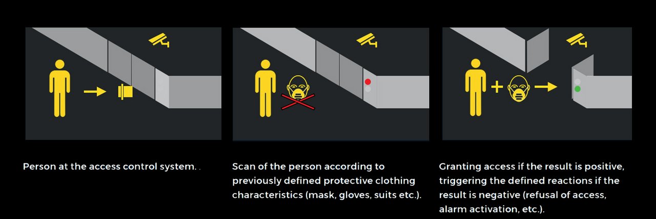 When the AI detects the required protective clothing, the safety area door is automatically unlocked. If the AI detects incomplete protective clothing, the entrance remains locked.