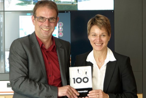 The “Top 100” award recognises innovation, team spirit and a thirst for knowledge. On 27 June 2014, TV science journalist Ranga Yogeshwar gives this award to Geutebrück GmbH, which managing directors Katharina Geutebrück and Christoph Hoffmann accept on behalf of the company.